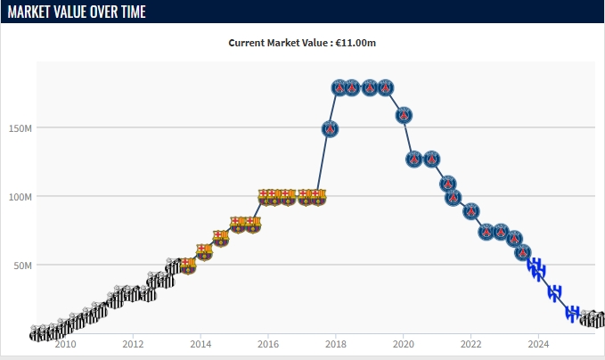 九游体育官方下载-两年暴跌近5000万!33岁内马尔身价跌至1100万欧,26岁巅峰1.8亿