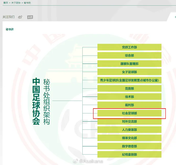 随后中国足协设立了社会足球部,负责此前的业余足球、群众足球工作。2016年修订的《中国足球协会章程》(网页链接 ),首次在中国足协《职责》中加入“普及发展社会足球,不断扩大足球人口规模。”直到如今,社会足球的职责一直明文写在中国足协章程中。社会足球部也一直存在,常年负责由中国足协主办的中冠联赛等业余赛事。